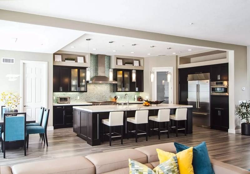 در اینجا جزیره آشپزخانه به بار صبحانه بدل شده تا مهمان ها دور گاز جمع نشوند. پیشخوان اضافه هم باعث می شود مهمان ها به بار نزدیک باشند. همچنین می توانید روی جزیره سینک هم نصب کنید. به جای چراغ ها هم چراغ های خطی گذاشته شده است. همچنین روبروی یخچال هم چراغ آویز نصب شده است.